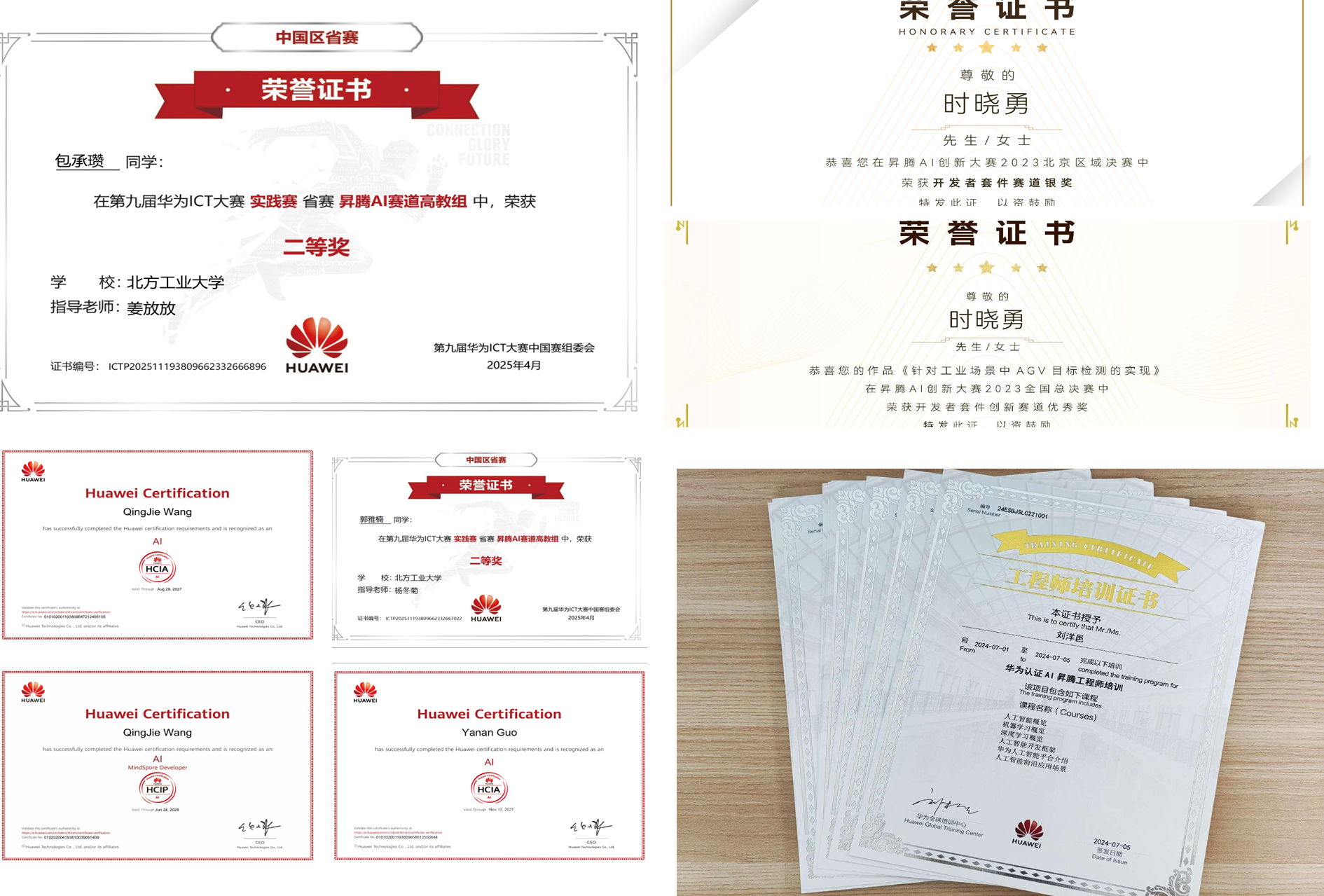 图2 学生获得的华为HCIA/HCIP-AI证书及昇腾AI创新大赛/华为ICT大赛获奖证书